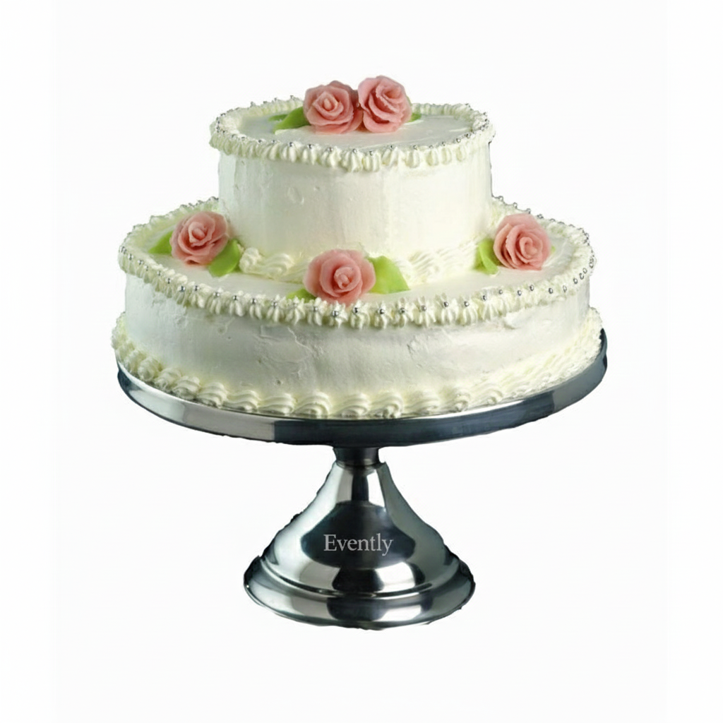 Opsatsen er udført i et tidløst design med en stabil fod, der sikrer, at kagen står sikkert under hele serveringen. Den blanke metalfinish giver et eksklusivt look, der passer til både bryllupper, konfirmationer og fødselsdage.